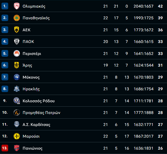 Έτσι, η βαθμολογία του ελληνικού πρωταθλήματος έμεινε ίδια, με την ομάδα του Γιώργου Μπαρτζώκα να παραμένει αήττητη (21-0) και τους «πράσινους» να βρίσκονται στην δεύτερη θέση.