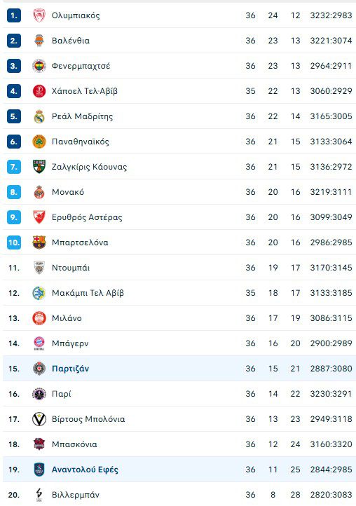 Στο άλλο παιχνίδι της ημέρας, η Αναντολού Εφές επικράτησε στην παράταση της Παρτιζάν με 79-72, ωστόσο βρίσκεται στη 19η θέση με 11Ν – 25Η, ενώ οι «ασπρόμαυροι» της Σερβίας είναι στην 15η θέση με 15 Ν – 21Η.
