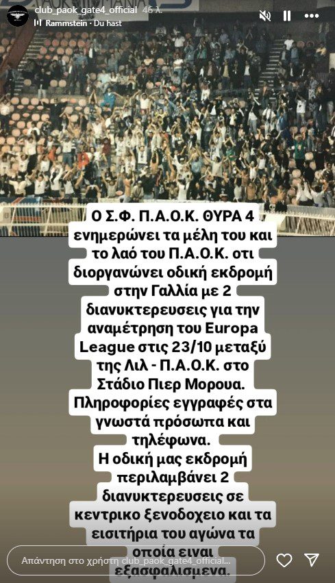 Πιο συγκεκριμένα σημειώνουν πως: «Ο ΣΦ ΠΑΟΚ ΘΥΡΑ 4 ενημερώνει τα μέλη του και τον λαό του ΠΑΟΚ ότι διοργανώνει οδική εκδρομή στην Γαλλία με 2 διανυκτερεύσεις για την αναμέτρηση του Europa League στις 23/10 μεταξύ της Λιλ-ΠΑΟΚ στο στάδιο Πιέρ Μορουά.