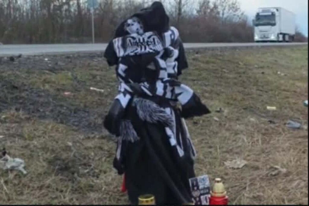 Μέσα σε αυτό το σκηνικό της καταστροφής, ξεχωρίζει το άτυπο μνημείο που έχει στηθεί πρόχειρα στο σημείο και ραγίζει καρδιές. Πάνω σε έναν ξύλινο σταυρό έχει τοποθετηθεί ένα κασκόλ του ΠΑΟΚ και μια μαύρη φανέλα, σύμβολα της αγάπης των θυμάτων για την ομάδα τους. Στη βάση του, ανάμεσα στα χόρτα, κόκκινα κεράκια καίνε στη μνήμη των αδικοχαμένων οπαδών, μαζί με μηνύματα από ανθρώπους που βρέθηκαν εκεί για να αποτίσουν φόρο τιμής.