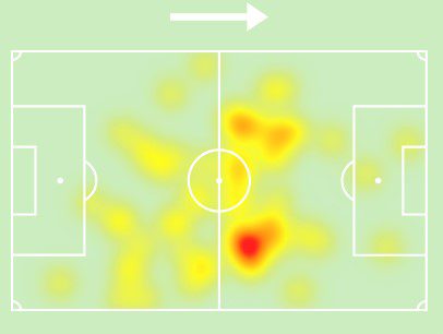 Ο 22χρονος δεν δυσκολεύτηκε να ελέγξει τον χώρο ευθύνης του, κινούμενος σχεδόν μόνιμα πάνω από τη μεσαία γραμμή, όπως δείχνει και ο θερμικός του χάρτης.