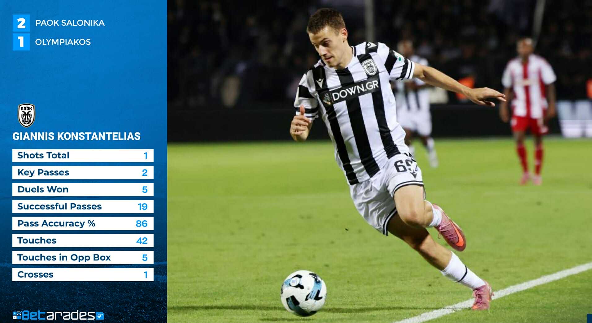 Ο Γιάννης Κωνσταντέλιας συνεχίζει να αποτελεί τον κορυφαίο εκφραστή της δημιουργίας του ΠΑΟΚ, με τον 22χρονο μεσοεπιθετικό να πραγματοποιεί ακόμα μία εντυπωσιακή εμφάνιση στο ντέρμπι με τον Ολυμπιακό στην Τούμπα. Ο νεαρός άσος ήταν ο παίκτης που έβαλε την υπογραφή του στη μεγάλη ανατροπή του Δικεφάλου, οδηγώντας την ομάδα του στη σπουδαία νίκη με 2-1 για τη Super League.