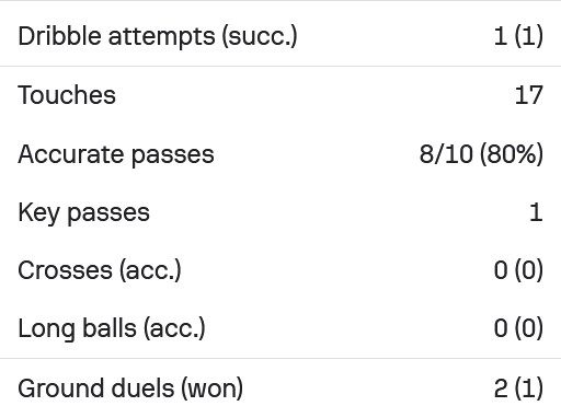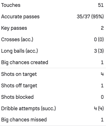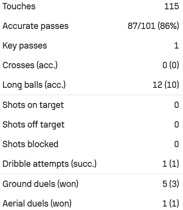 Ο Σέρχιο Πένια έγραψε περισσότερες από 100 πάσες στην αναμέτρηση, έχοντας ποσοστό επιτυχίας στο 865 καθώς είχε 87/101 πάσες. Από αυτές οι 12 ήταν μακρινές μεταβιβάσεις, με τις 10 να είναι εύστοχες. Είχε επίσης μια πετυχιμένη ντρίμπλα και 4/6 στις μονομαχίες.