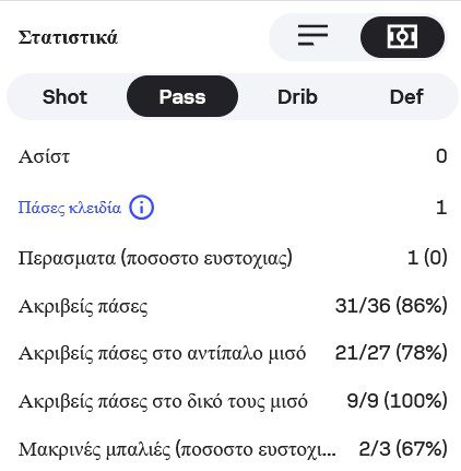 Ο Βραζιλιάνος είχε 86% στις πάσες, και συγκεκριμένα78% στις πάσες που επιχείρησε πάνω από τη μεσαία γραμμή, ενώ είχε και μια key pass (πάσα που κατέληξε σε τελική προσπάθεια).