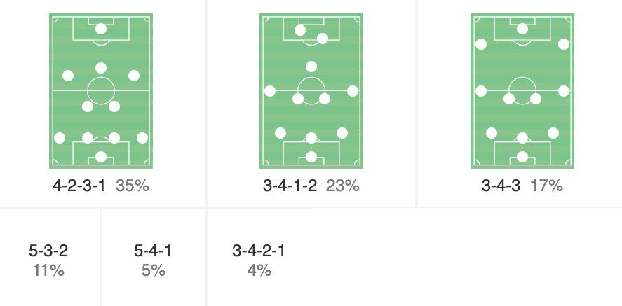 Από τότε που εγκατέλειψε το 4-2-3-1, χρησιμοποιεί κυρίως 3-4-3 ή 3-4-1-2, ανάλογα με τον αντίπαλο και τις ανάγκες του αγώνα (αν θα παίξει με έναν ή δύο επιθετικούς).
