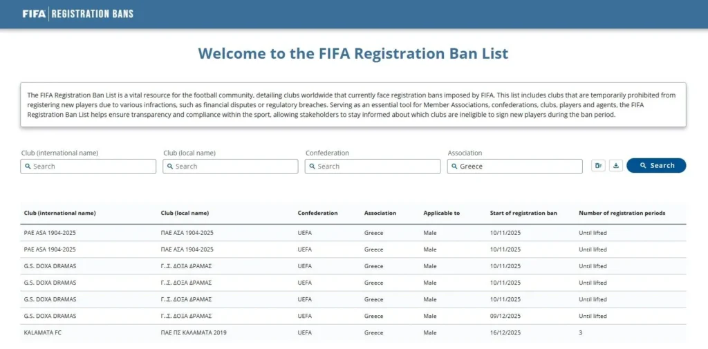 Παράλληλα, στην ιστοσελίδα της FIFA υπάρχει αναφορά για απαγόρευση μεταγραφών στην Καλαμάτα, για τις επόμενες τρεις μεταγραφικές περιόδους, η οποία ξεκινά από τις 16 Δεκεμβρίου.
