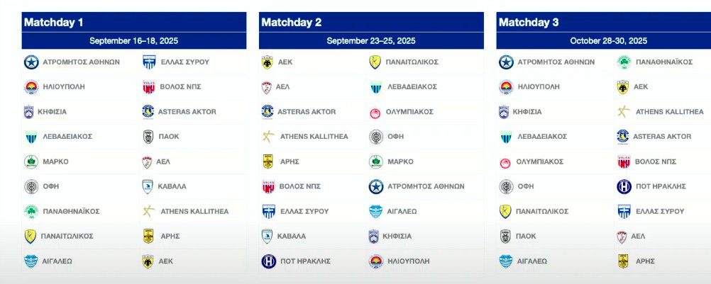 Στην πρώτη αγωνιστική, στις 16-18 Σεπτεμβρίου, ο ΠΑΟΚ θα ξεκινήσει τις υποχρεώσεις του στη Λιβαδειά απέναντι στον Λεβαδειακό. Ο ΠΑΟΚ και ο Παναθηναϊκός δε θα παίξουν στη 2η αγωνιστική λόγω ευρωπαϊκών υποχρεώσεων, ενώ ο Ολυμπιακός στην 1η.