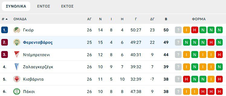 Η βαθμολογία στο πρωτάθλημα Ουγγαρίας