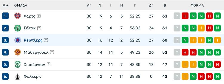 Η βαθμολογία στο πρωτάθλημα Σκωτίας