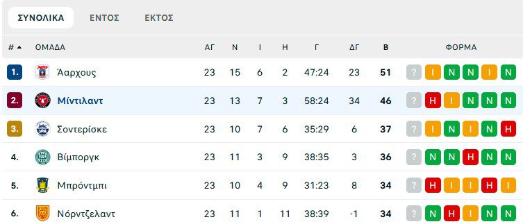 Η βαθμολογία το πρωτάθλημα Δανίας