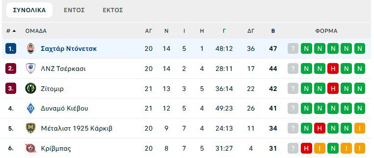 Η βαθμολογία στο πρωτάθλημα Ουκρανίας