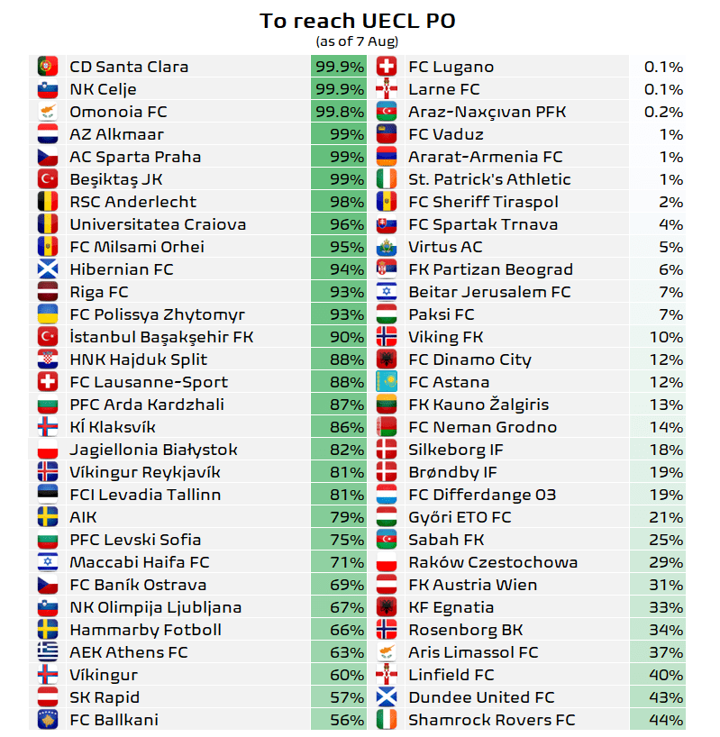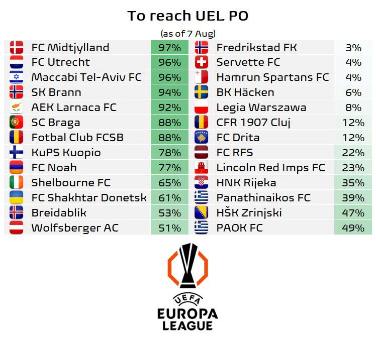 Ο Παναθηναϊκός έχει μόλις 39% πιθανότητες για να προκριθεί στον επόμενο γύρο της διοργάνωσης, ενώ ο ΠΑΟΚ συγκεντρώνει 49% πιθανότητες να ξεπεράσει τη Βολφσμπέργκερ και να συνεχίσει την πορεία του στο Europa League.