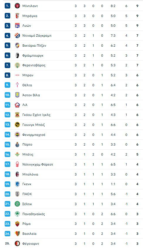 Βαθμολογία Europa League: Ο ΠΑΟΚ πέτυχε τρομερό διπλό με 3-4 στη Λιλ στο πλαίσιο της 3ης αγωνιστικής του League Phase του Europa League και σκαρφάλωσε στον βαθμολογικό πίνακα.