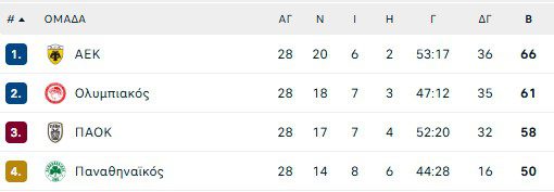 Η ΑΕΚ έχτισε διαφορά μετά τη νίκη επί του ΠΑΟΚ με 3-0, με τους «ερυθρόλευκους» να ακολουθούν στη 2η θέση έχοντας πέντε βαθμούς λιγότερους και τρεις βαθμούς περισσότερους από τον Δικέφαλο.
