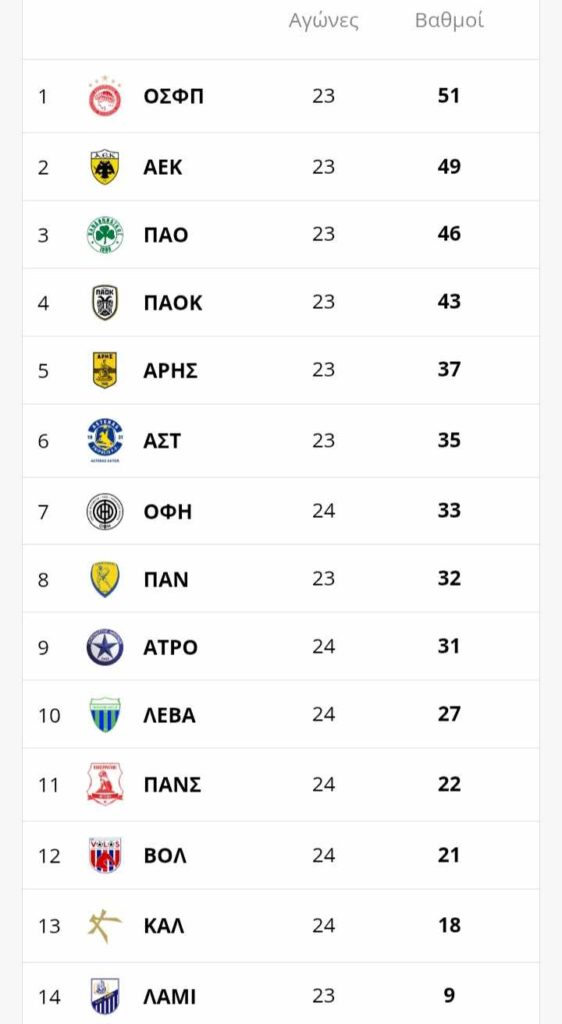 H Βαθμολογία της Super League: