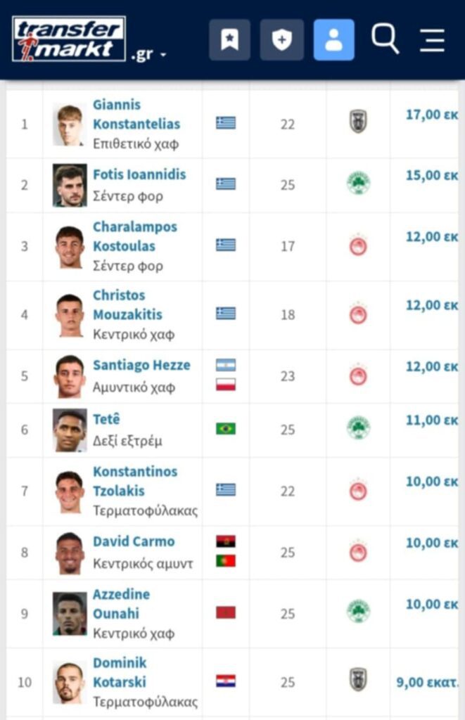 Δείτε την πρώτη δεκάδα με τους παίκτες της Super League, σύμφωνα με το Transfermarkt, στην κορυφή της οποίας βρίσκεται ο Κωνσταντέλιας: