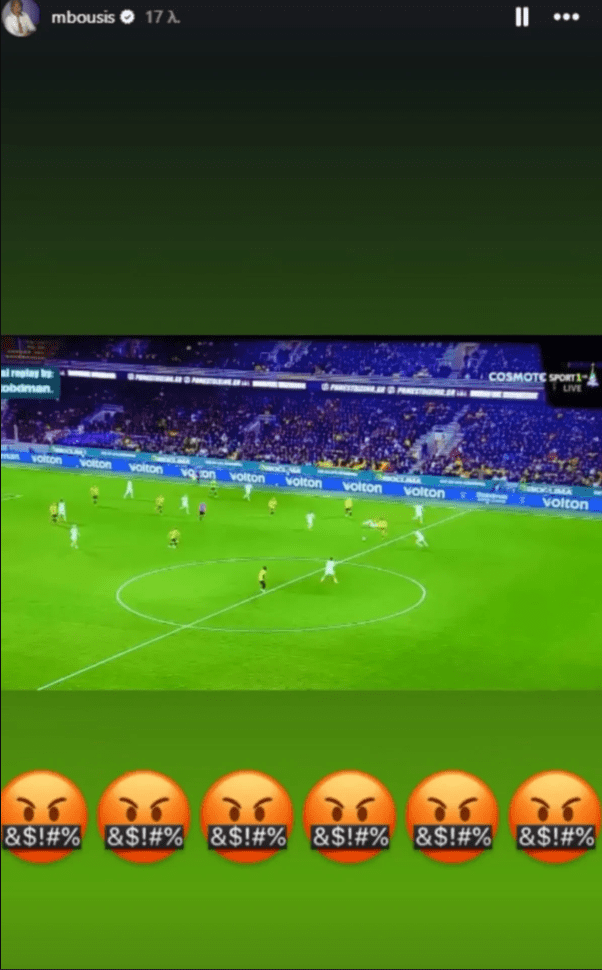 Μέσα από stories στο Instagram, ο Μιχάλης Μπούσης ανέβασε τα δύο γκολ της ΑΕΚ συνοδεύοντάς τα με οργισμένα emojis, δείχνοντας ξεκάθαρα την αγανάκτησή του για όσα συνέβησαν στο ματς.