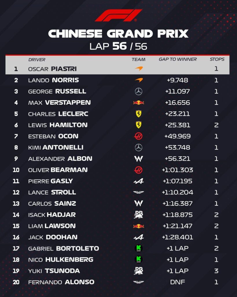 Ο Όσκαρ Πιάστρι κυριάρχησε από την αρχή ως το τέλος στο Grand Prix της Κίνας κατακτώντας τη νίκη και χαρίζοντας στη McLaren ένα σπάνιο 1-2, αφού ο Λάντο Νόρις τερμάτισε δεύτερος.