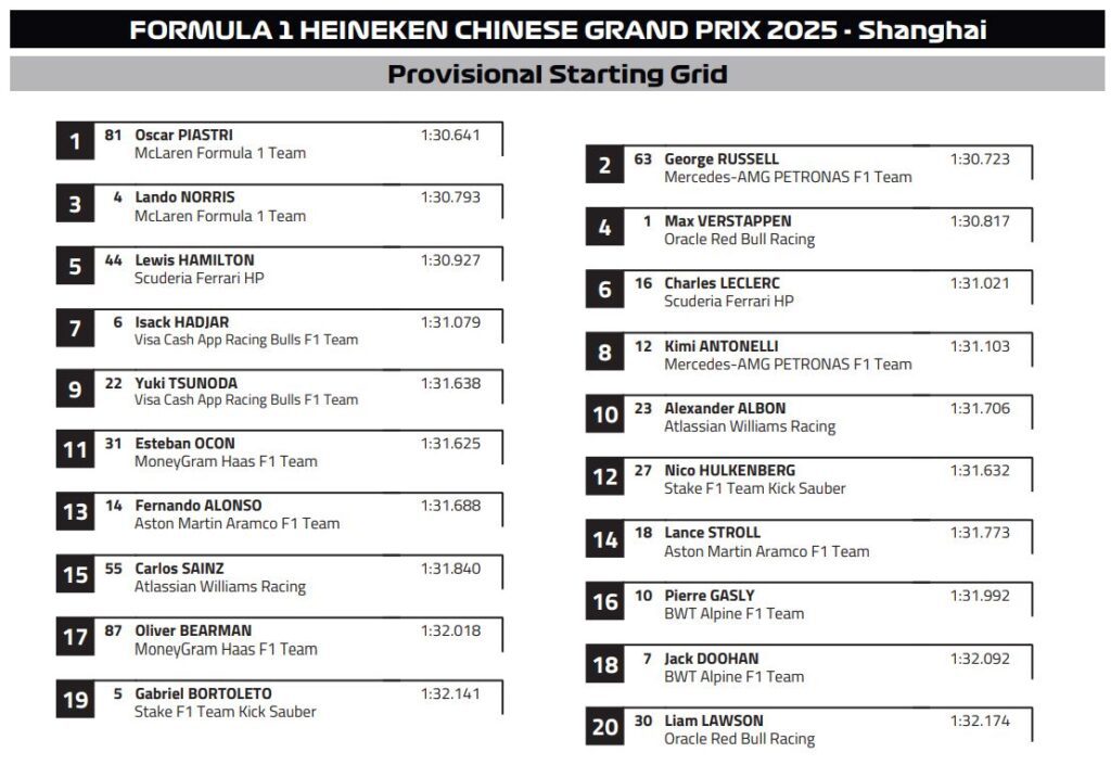 Η σειρά εκκίνησης για τον GP Κίνας είναι: