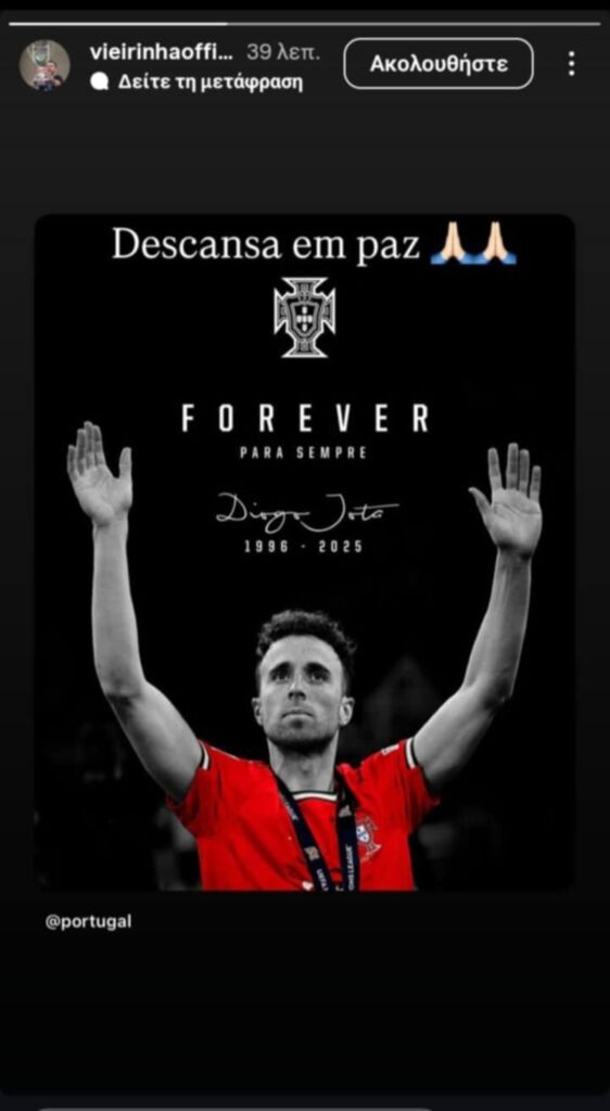«Αναπαύσου εν ειρήνη», ανέφερε χαρακτηριστικά ο Βιεϊρίνια, συνοδεύοντας το μήνυμά του με μία φωτογραφία του αδικοχαμένου Ντιόγκο Ζότα, με τον οποίο τους συνέδεε η κοινή καταγωγή.