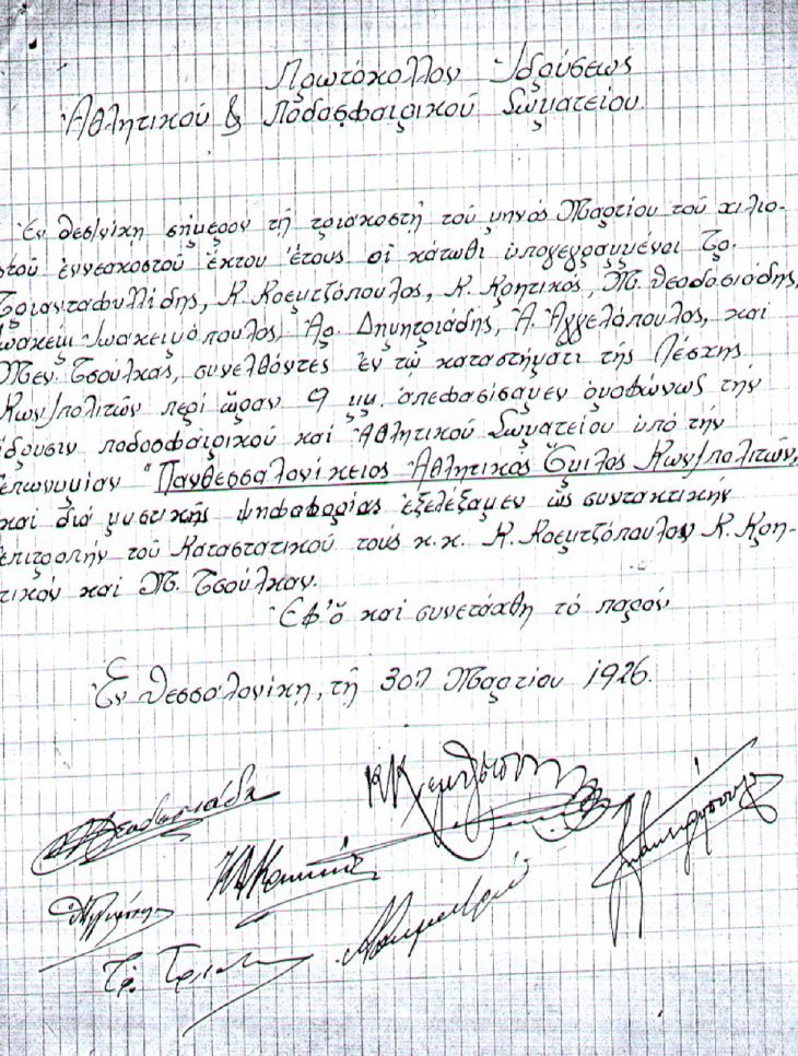Εν Θεσσαλονίκη σήμερον τη τριακοστή του Μηνός Μαρτίου του χιλιοστού εννεακοσιοστού εικοστού έκτου έτους οι κάτωθι υπογεγραμμένοι Τρ. Τριανταφυλλίδης, Κ. Κοεμτζόπουλος, Κ. Κρητικός, Μ. Θεοδοσιάδης, Ιωακείμ Ιωακειμόπουλος, Αρ. Δημητριάδης, Α. Αγγελόπουλος, και Μεν. Τσούλκας, συνελθόντες εν τω καταστήματι της Λέσχης Κων/ πολιτών περί ώραν 9 μ.μ. απεφασίσαμεν ομοφώνως την ίδρυσιν ποδοσφαιρικού και Αθλητικού Σωματείου υπό την επωνυμίαν «Πανθεσσαλονίκειος Αθλητικός Όμιλος Κων/πολιτών» και διά μυστικής ψηφοφορίας εξελέξαμεν ως συντακτικήν επιτροπήν του Καταστατικού τους κ.κ. Κ. Κοεμτζόπουλον, Κ. Κρητικόν και Μ. Τσούλκαν.