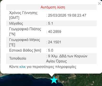 Σεισμός μεγέθους 4,9 Ρίχτερ σημειώθηκε στις 21:08 το βράδυ της Τετάρτης (25/3) στο Άγιο Όρος, προκαλώντας ανησυχία στους κατοίκους της ευρύτερης περιοχής.